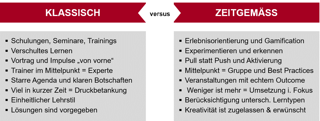 Beispielsweise gibt es längst bekannte Prinzipien betrieblicher Veränderungsarbeit. So existiert seit vielen Jahren die sogenannte 72 Stunden-Regel“, welche besagt, dass alles was nicht innerhalb von 3 Tagen nach einem Training umgesetzt wird, nie stattfindet.